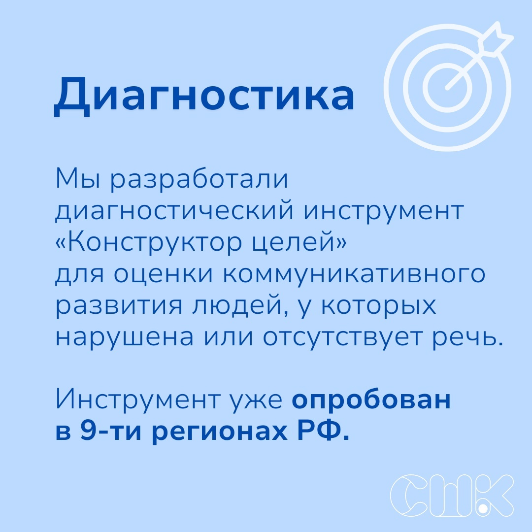 И самое важное: мы апробировали инструмент «Конструктор целей» для оценки коммуникативного развития людей, у которых нарушена или отсутствует речь. Диагностический инструмент поможет логопедам, педагогам, дефектологам и другим специалистам, которые работают с людьми с особенностями развития, учесть индивидуальные особенности человека, его словарный запас, коммуникативные навыки. С помощью конструктора специалисты смогут выделить сильные и слабые зоны, сформировать цели для развития и подобрать способы освоения АДК.