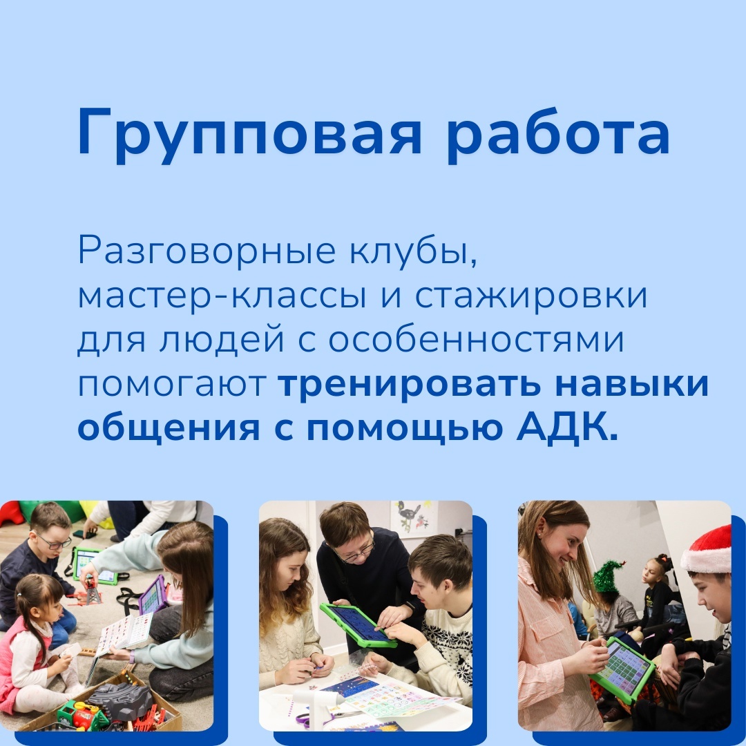 - Организовывали групповые формы работы для детей и взрослых с особенностями развития: разговорные клубы, стажировки и мастер-классы, где участники практиковали общение с помощью АДК и учились самостоятельности.