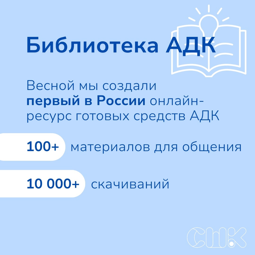 - Запустили Библиотеку АДК — онлайн-архив материалов для общения неговорящих людей. Посетить нашу Библиотеку вы можете по ссылке.